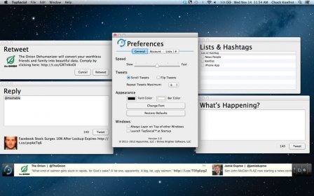 Stay updated on your latest Twitter posts without interrupting your workflow with TapSocial for Mac. This simple tool lets you monitor your Twitter feed seamlessly, displaying tweets directly on your desktop like a traditional news ticker. Say goodbye to constantly switching between tabs or launching heavy applications — TapSocial brings your Twitter feed right to your Mac's dock.