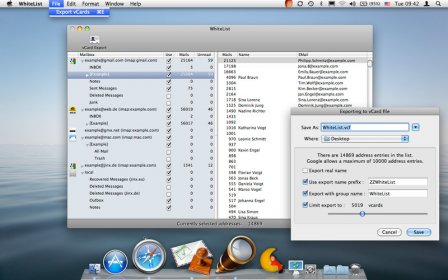 WhiteList helps you efficiently manage your email contacts by generating a list of people you've interacted with. This list, often referred to as a whitelist for email spam, includes real individuals you’ve emailed, making it easier to ensure your important messages are delivered without issue. Export your whitelist as v-cards to quickly add contacts to your address book or email provider.