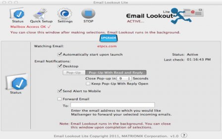 Email Lookout Lite for Mac ensures you never miss important messages with instant email alerts and seamless reply functionality. Receive real-time pop-up notifications and type replies directly from the alert window without opening your inbox. Plus, get text message notifications on your mobile device when a new email arrives, so you're always in the loop.