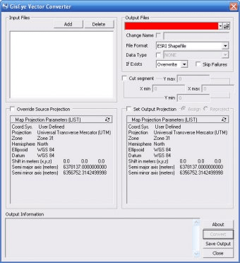 The left side of the application window allows you to control the input vector map parameters, while the right side lets you manage output settings. At the bottom, the information field keeps you updated on the conversion progress. Whether you're looking to re-project maps, change names, or merge multiple files, GISEYE Vector Converter is the ultimate solution for all your vector map conversion needs.