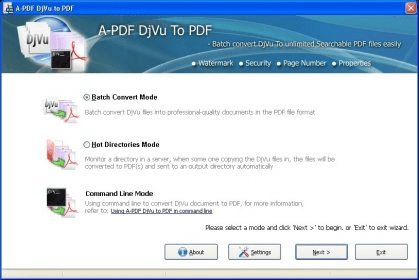 This tool offers advanced features for customizing your PDFs, including adding security options, watermarks, and page numbers. You can also modify the layout of your PDF pages and adjust how they are displayed when opened. With the ability to add basic metadata like author, title, and keywords, A-PDF DjVu to PDF makes managing and organizing your PDFs a breeze. Choose from three convenient modes: batch mode, Hot Directory mode, and command line mode. The Hot Directory mode is especially useful, as it runs in the background and automatically converts newly added DjVu files into PDFs without any manual input.