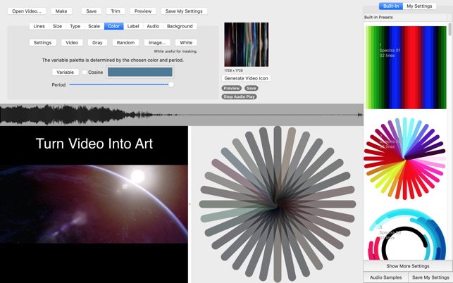 Leverage the app’s built-in presets, video and audio samples to quickly generate 3D artwork or take full creative control by adjusting settings, video inputs, and color palettes. You can use video frames to generate color palettes, and manipulate audio to control line or arc lengths for a dynamic, interactive art experience. Spectra's intuitive interface makes it easy to experiment and discover new ways to bring your multimedia creations to life.