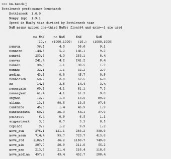 Python Bottleneck. Bottleneck is a collection of fast NumPy array functions written in Cython.
