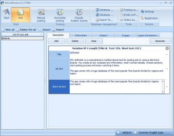 ESC AdPoster is a comprehensive multifunctional solution that streamlines how you post ads across various electronic boards. Create your ad, add text and contact details, select sections, start the posting process, and watch everything run automatically. It’s built for users who want fast workflow, scalable distribution, and efficient online promotion.