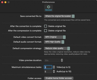 The utility opens with a straightforward, intuitive interface divided into three clear sections: video conversion, video compression, and audio conversion. The Preferences menu lets you fine-tune your workflow by automatically deleting original files, setting default video and audio formats, choosing a favorite compression strategy, defining the maximum number of simultaneous tasks, managing folder access, and more. Output profiles are neatly organized by formats, devices, and social platforms, and each profile can be customized with advanced encoding settings, making this a flexible batch media converter.