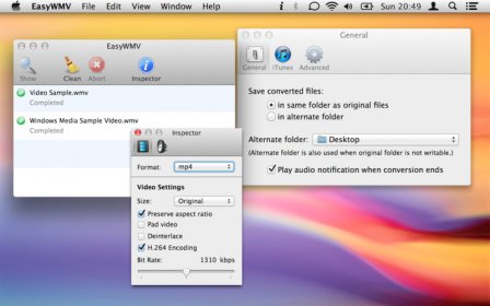 EasyWMV is a simple, ultra-light video converter designed for fast, no-friction workflows. Its single drop-zone window lets you drag in ASF, AVI, M4V, MPG, MP4, MPEG, MOV, NSV, SWF, VOB, WMV, and RM files, which instantly begin converting to MPEG-4 or H.264 in an MP4 container. Before dropping a file, you can fine-tune audio and video settings in the Inspector panel—select formats, adjust quality, and choose from optimized conversion profiles. This smooth, beginner-friendly setup is perfect for quick jobs, social media video prep, or fast batch tasks.