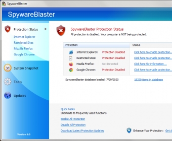 SpywareBlaster has a unique approach to system protection. Unlike other antivirus tools, it doesn't need to run continuously in the background, making it resource-friendly and non-intrusive. Instead, the application downloads and maintains a blacklist of untrusted websites, which it adds to your browser's security settings. To keep your protection up to date, the blacklist must be manually refreshed unless you opt for the premium version. Additionally, SpywareBlaster lets you disable Flash content and take system snapshots to easily restore your browser and system settings if needed.