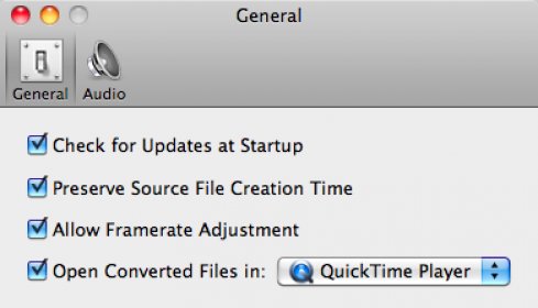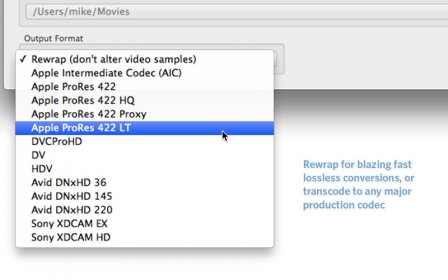 Simply import your clips, select your output format (Apple Intermediate Codec, Apple ProRes, DVCProHD, DV, HDV, Avid DNxHD, or Sony XDCAM), choose a frame rate from 24 to 60 fps, and hit “Convert.” Preferences include preserving file creation date, frame-rate adjustment, auto-opening converted videos, and LPCM audio conversion with stereo downmix or multichannel output.