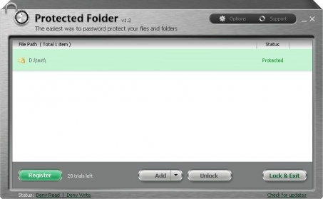 Set a master password the first time you open Protected Folder. Each session requires this secure login, ensuring only you can lock, unlock, and manage your protected items. Use the intuitive interface to add files via the “Add” button or drag-and-drop. Three security modes let you hide items from Explorer, block read access, or block write access—perfect for safeguarding confidential files, preventing accidental edits, and keeping your data safe.